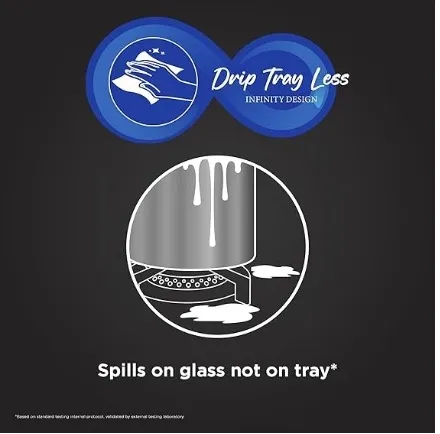 • Drip Tray Less design where spills happen mostly on glass not on tray